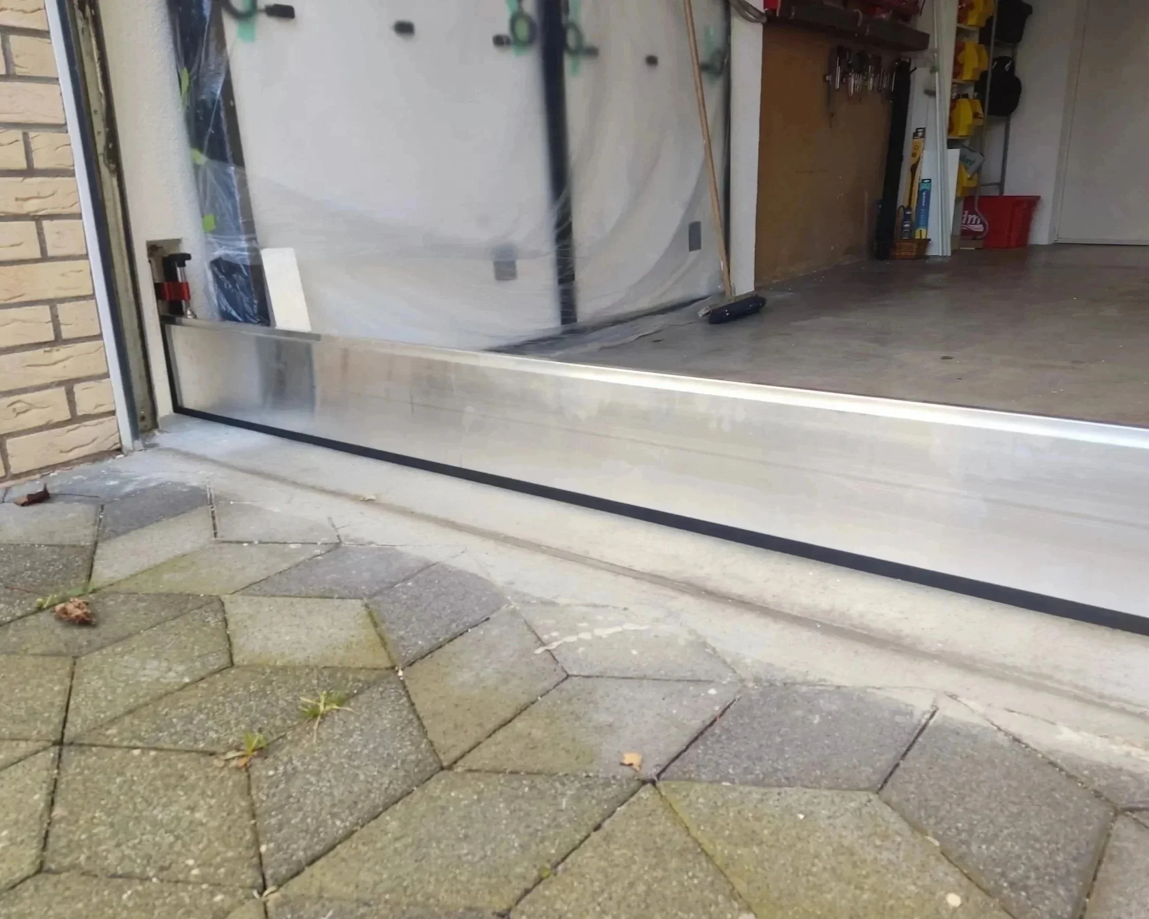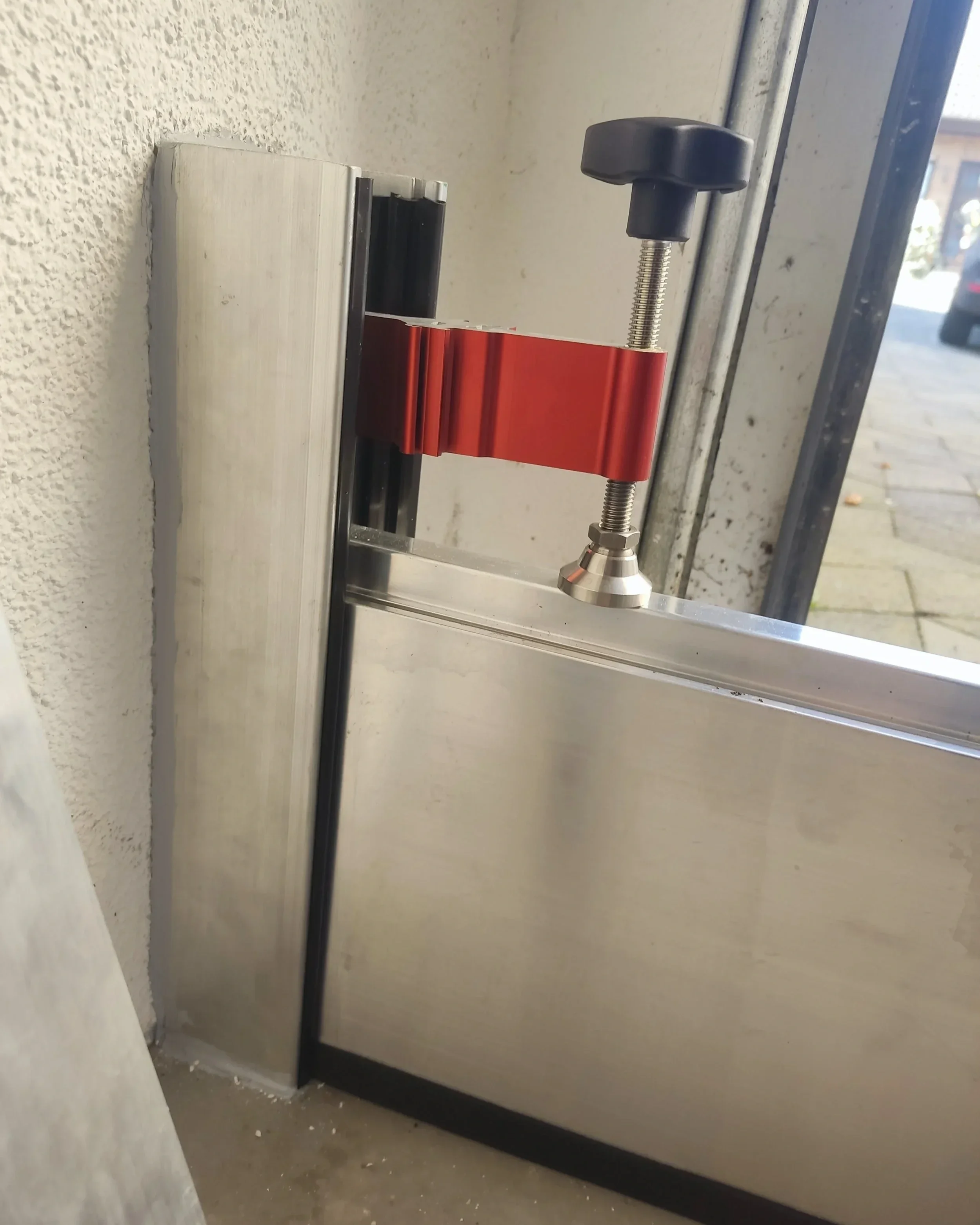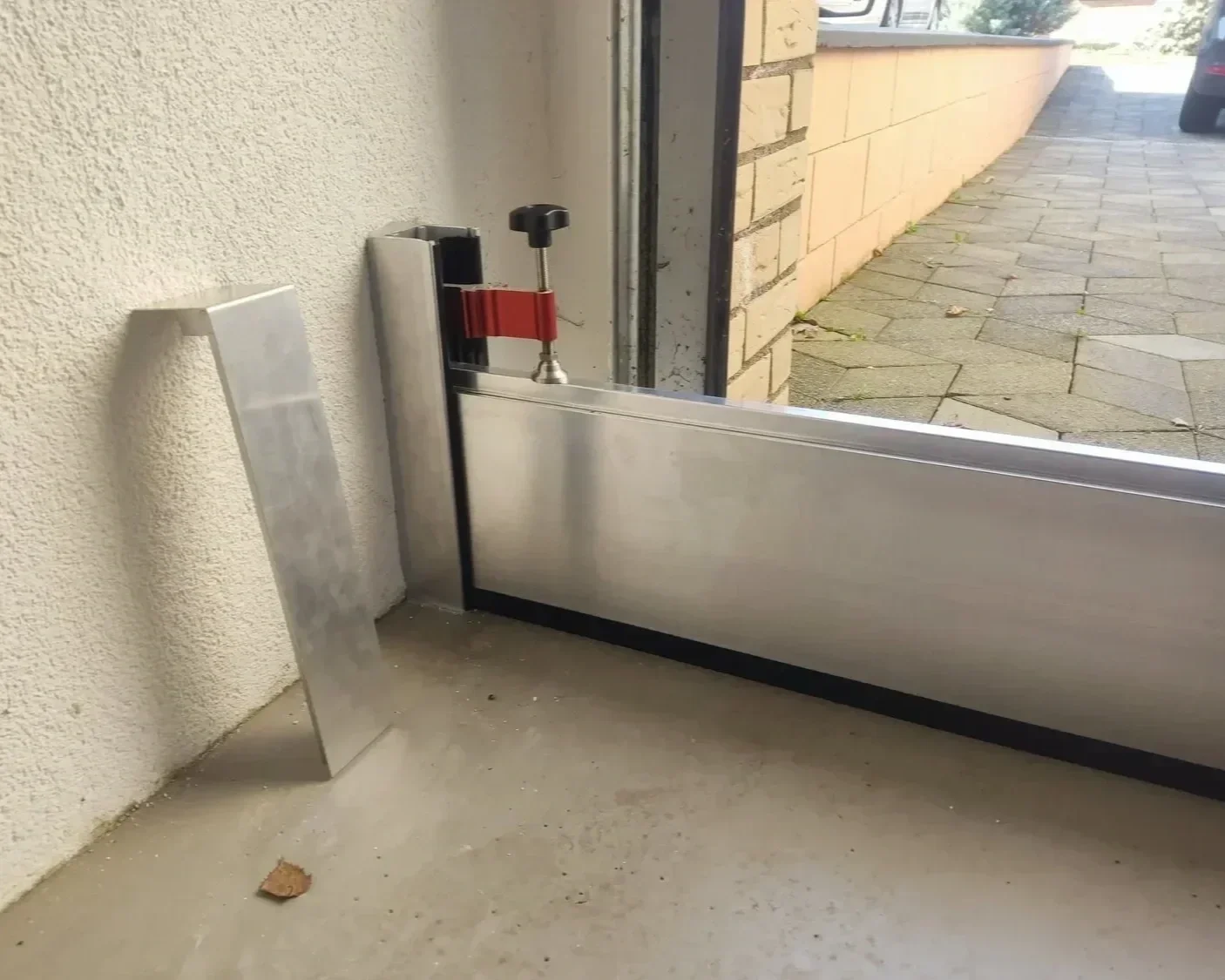 Die Befestigungsprofile können je nach Einbausituation vor, hinter oder in der Leibung montiert und fachgerecht abgedichtet werden. Im Vergleich zu Waben- oder Modulplatten benötigen Dammbalken keine U-Schiene im Boden. Das schont den Boden und ist auch optisch die ansprechendere Lösung. Voraussetzung für eine sichere Funktion ist jedoch ein ausreichend ebener und wasserbeständiger Untergrund.